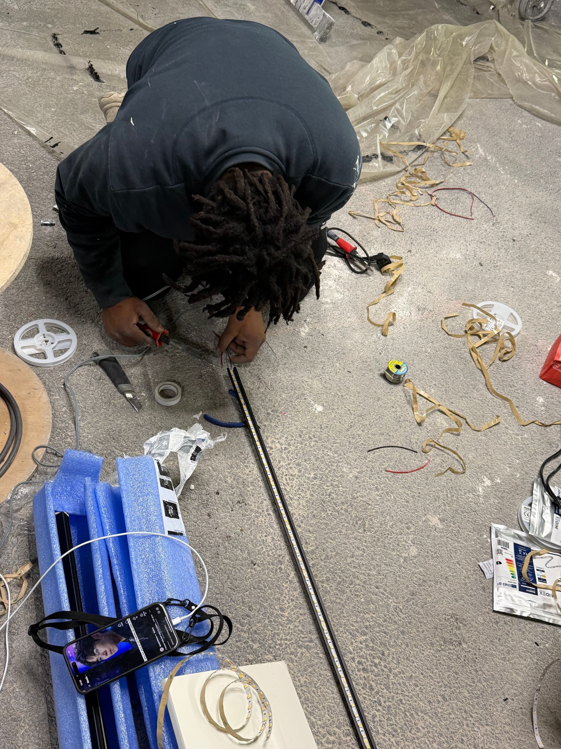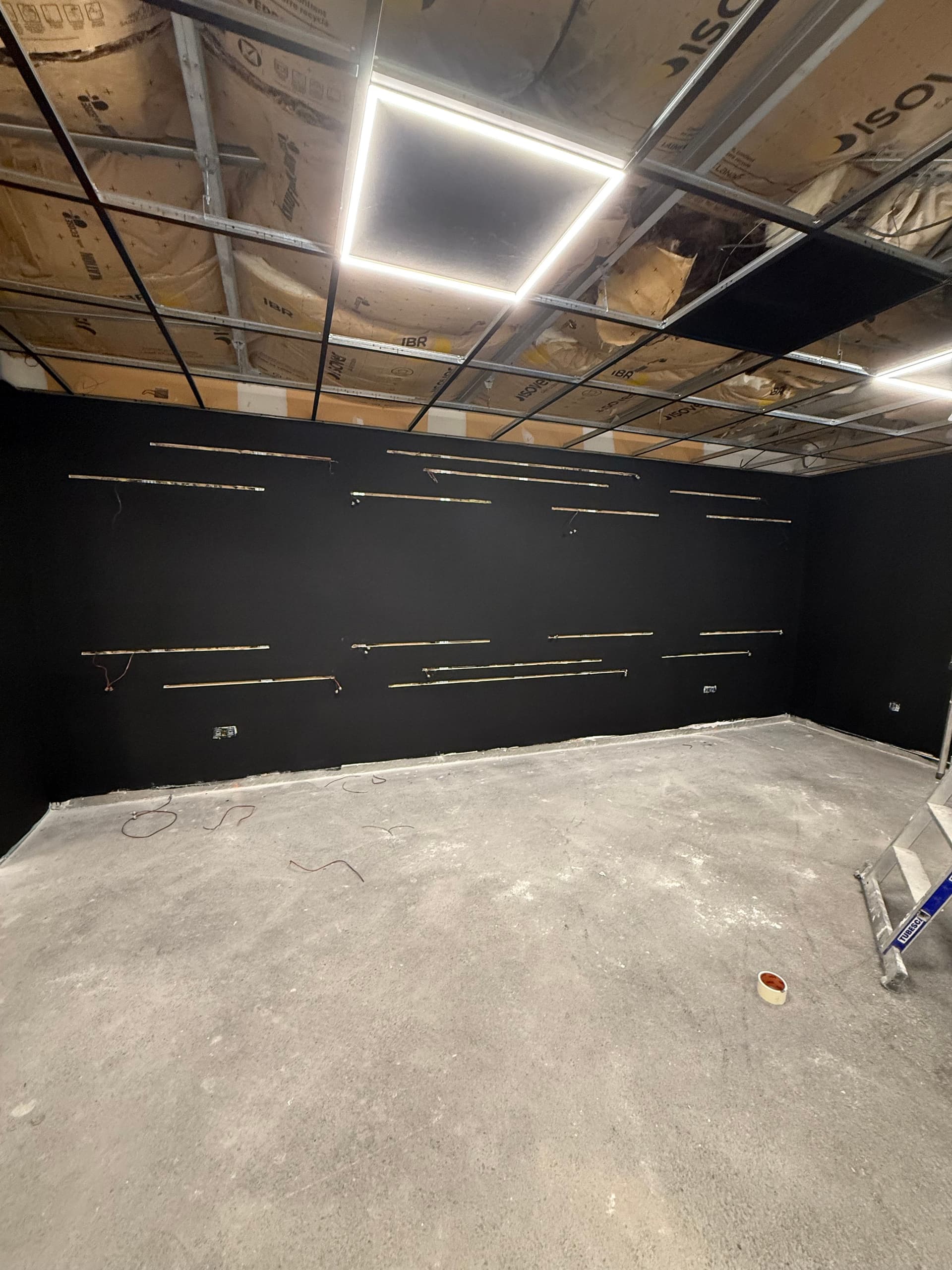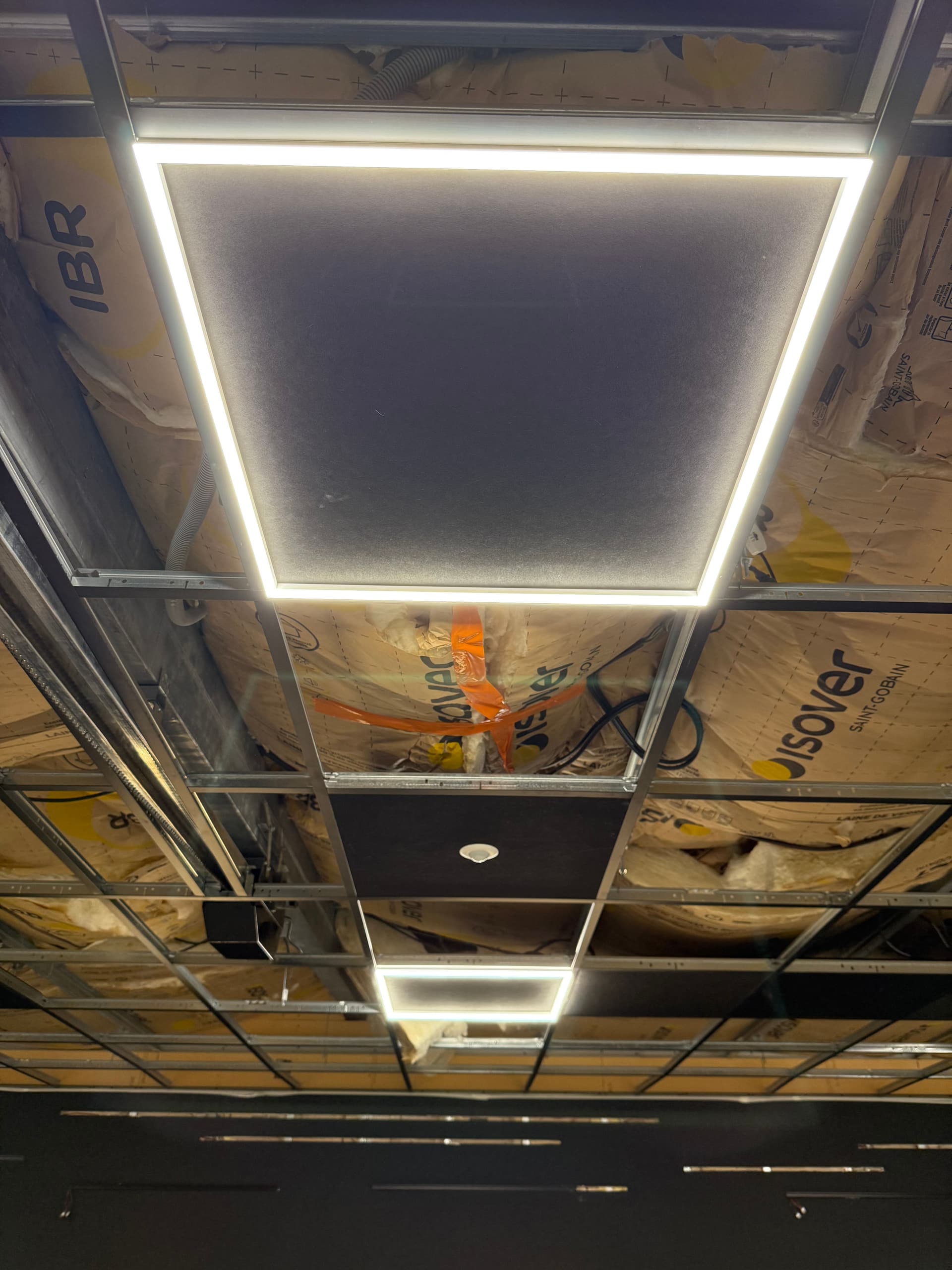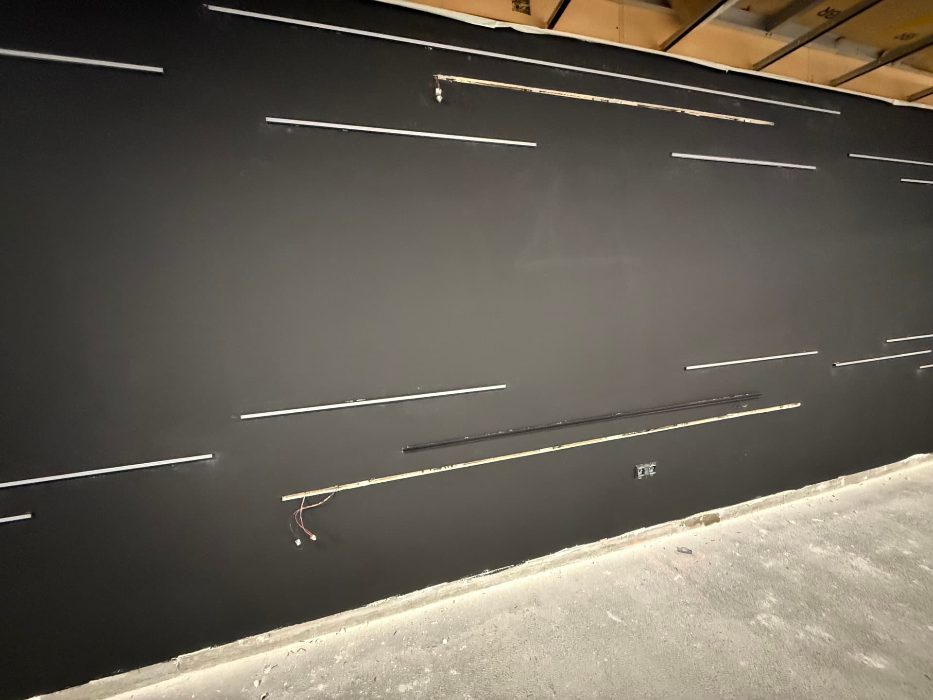 L’intégration des rubans LED sur profilés encastrés a nécessité une préparation précise des supports afin d’obtenir un rendu linéaire, homogène et parfaitement intégré aux parois.